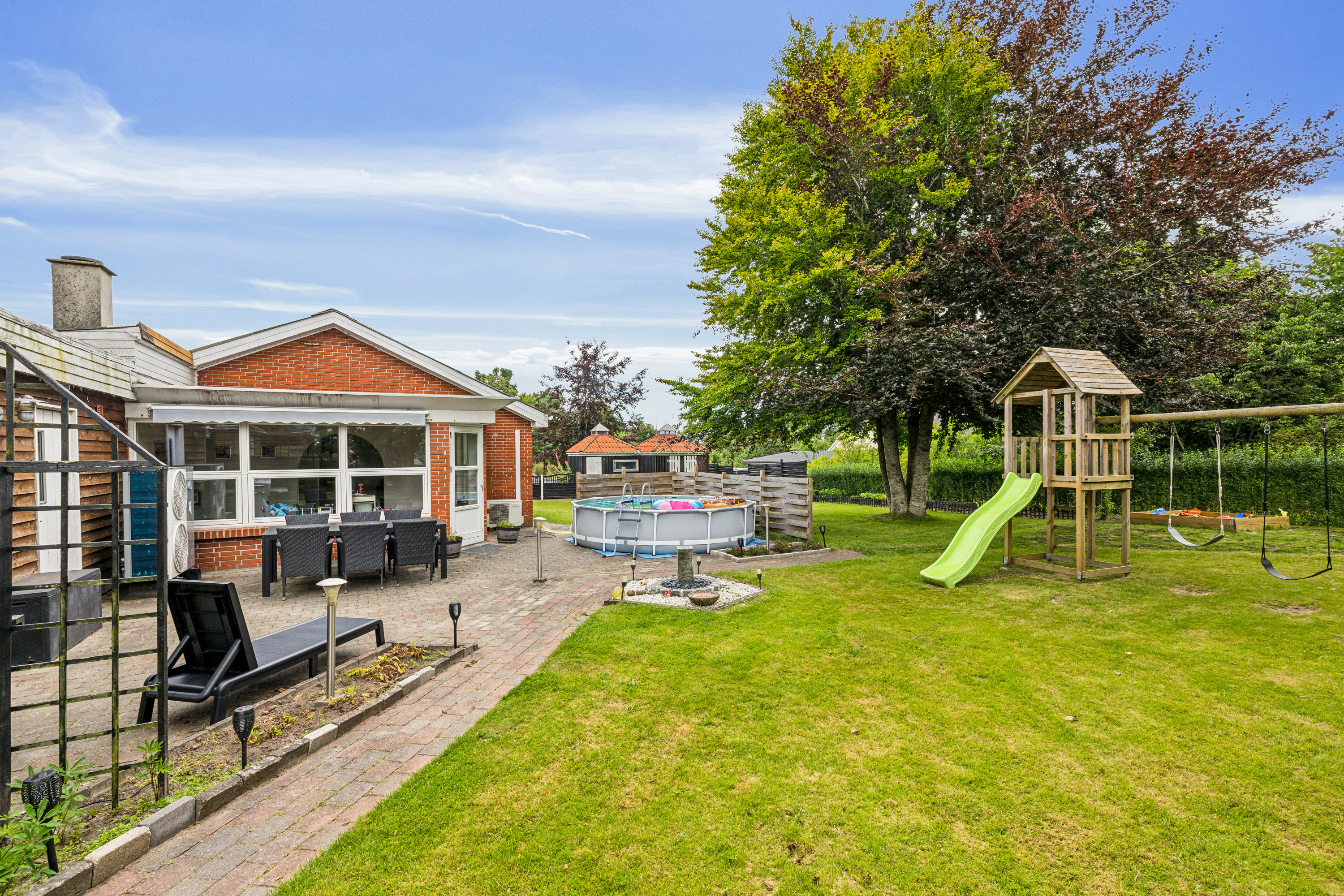 Grunden er på hele 1.046 m² og anlagt primært med græs og stemningsfulde træer, hvilket giver rig mulighed for leg, boldspil og haveprojekter. Der er desuden flere udhuse og skure, som giver fine opbevaringsmuligheder til haveredskaber, cykler eller hobbyprojekter.