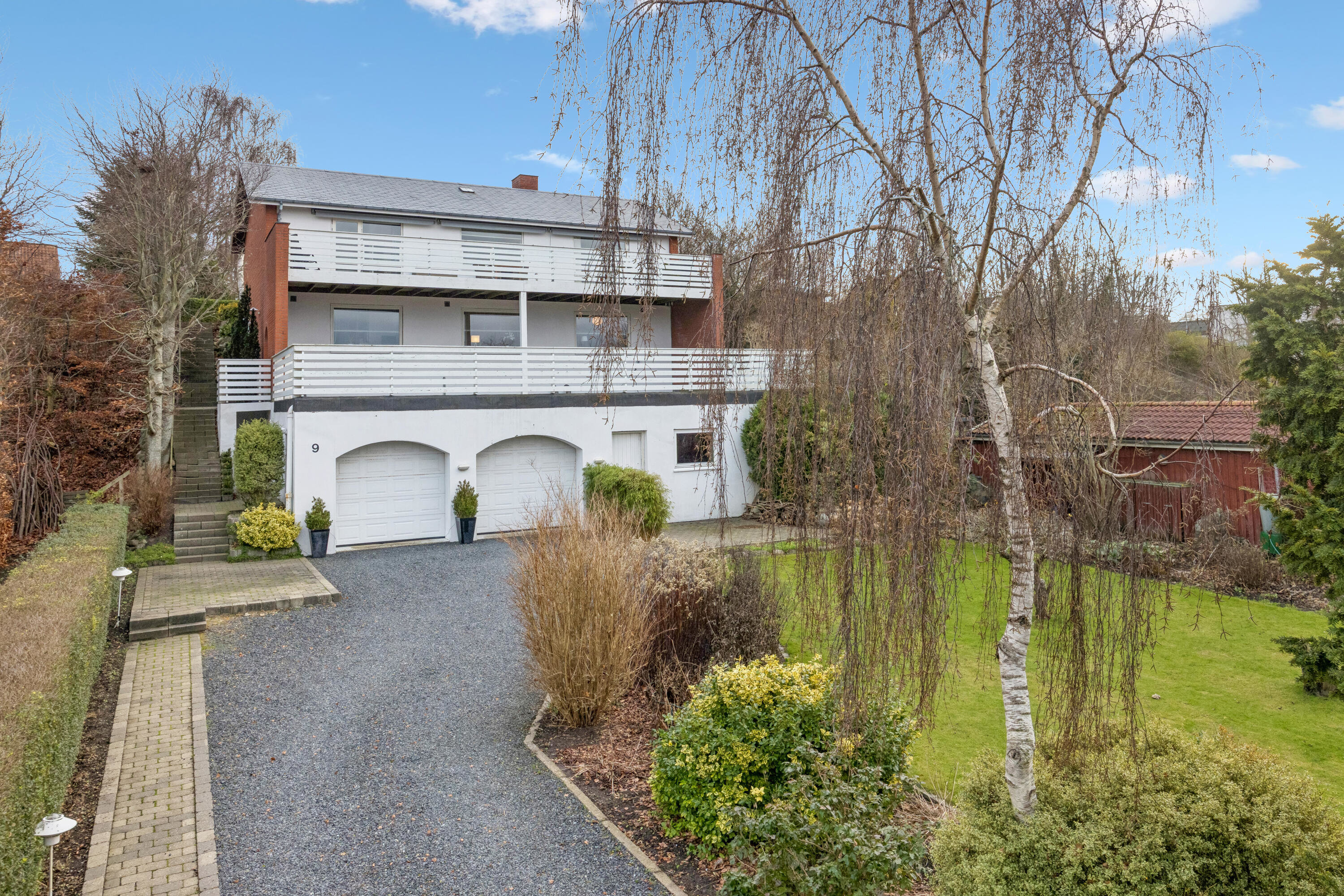 Et skønt udeliv. Det er en velholdt rødstensvilla fra 1970 og en fin forhave, der modtager jer på adressen. Villaen folder sig ud i to etager, og dertil kommer en stor, anvendelsesrig dobbelt garage, mens to brede, vestvendte terrasser forlænger de to etager. Det er særligt oppe på den øverste, at udsigten vil holde jer med selskab, og I kan kigge over kvarterets tage, trætoppene og fjorden, der breder sig i kulissen. Fortil får I en flot anlagt have med endnu en terrasse, alverdens fine bede og med masser af solchancer.