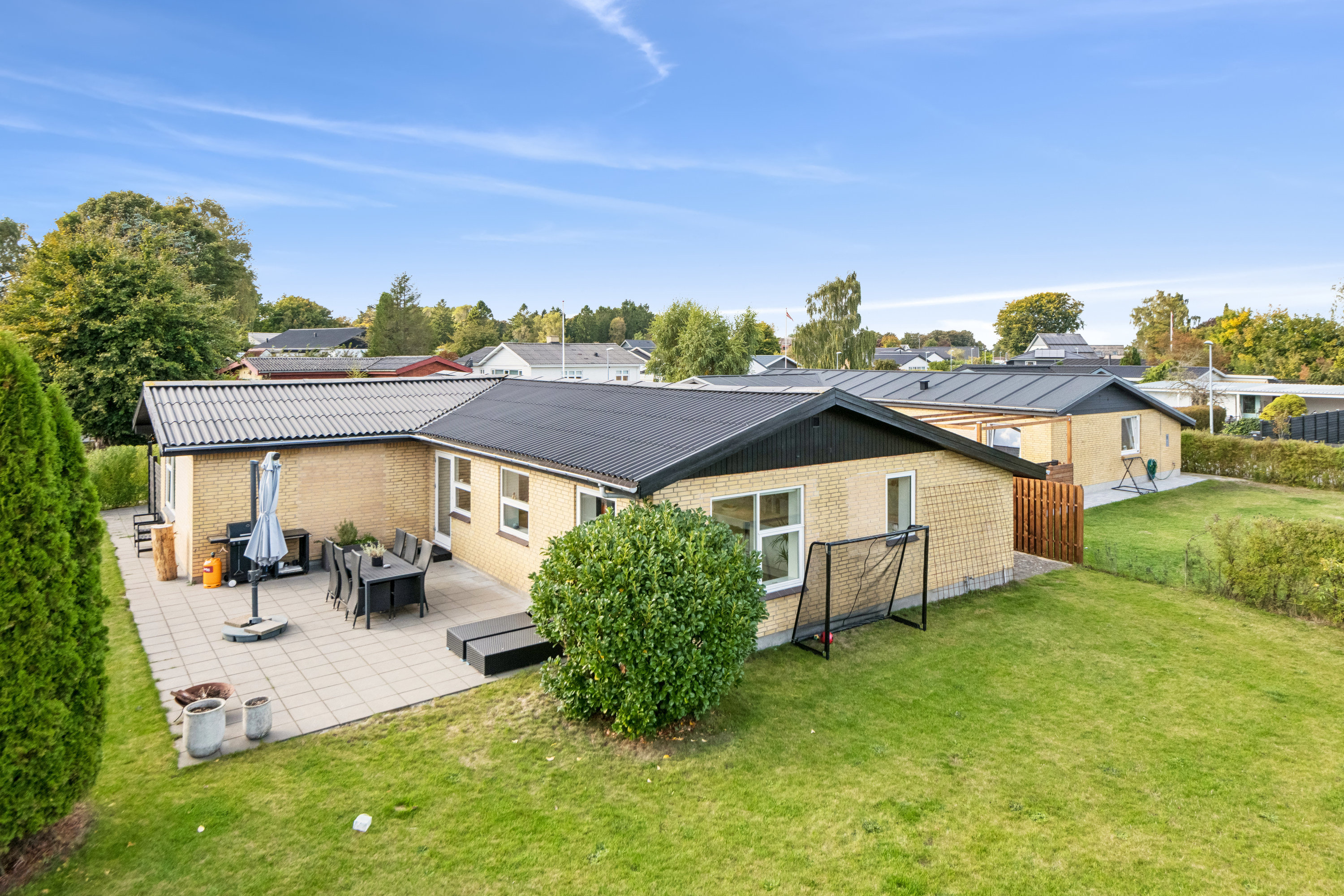 Sol og hyggelige rammer om udelivet. Det lyder jo som opskriften på mange dejlige dage ude i det fri. I stuen inviterer terrassedøren ud til en sydøstvendt terrasse, hvor I kan slappe af på de lune fliser og holde øje med børnene, mens de brænder krudtet af på trampolinen eller leger tagfat i haven. Der er nemlig plads til lidt af hvert på den grønne græsplæne, som allerede prydes af et udhus samt flere hyggekroge. Vejen, I bosætter jer på, ender desuden blindt, og herfra drejer I bilen ind i en carport ved ankomst – forbi endnu en fliseterrasse, hvor I også kan koble af.