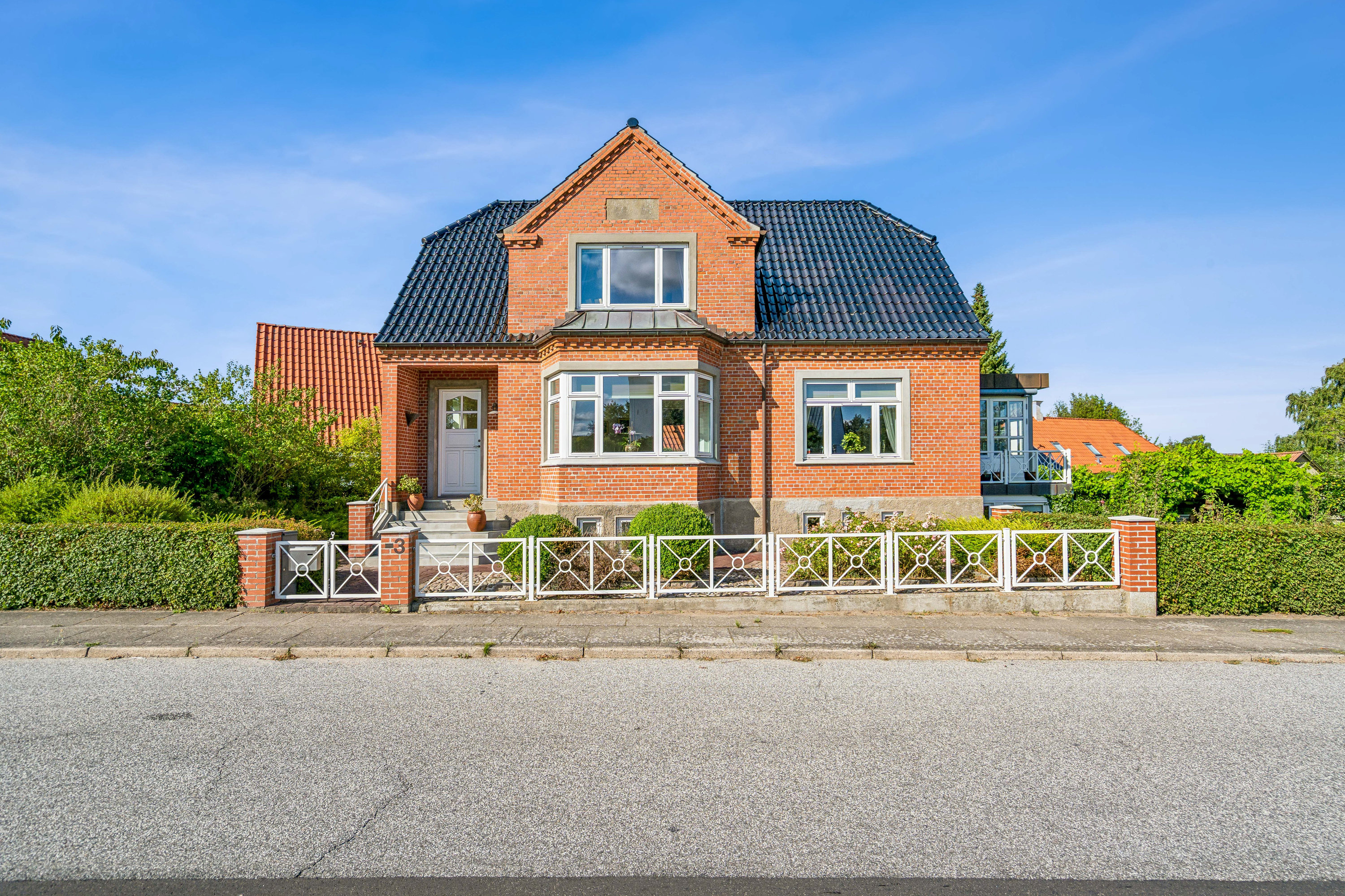 Det første du møder er en majestætisk forhave og smuk facade der emmer af kvalitet. Villaen er indrammet af en pæn plæne, farverige bede med buske og blomster samt smukke æbletræer, som hele familien nok skal få stor glæde af. Herudover finder I en stor fliseterrasse med plads til lange sommeraftener, solrige dage, afslapning og hygge, hvad end I foretrækker sol eller skygge. I forlængelse af stuen finder I desuden en utroligt fin kobberindfattet udestue med godt indeklima hele året med udgang til terrasse. En stor garage fuldender ejendommen.