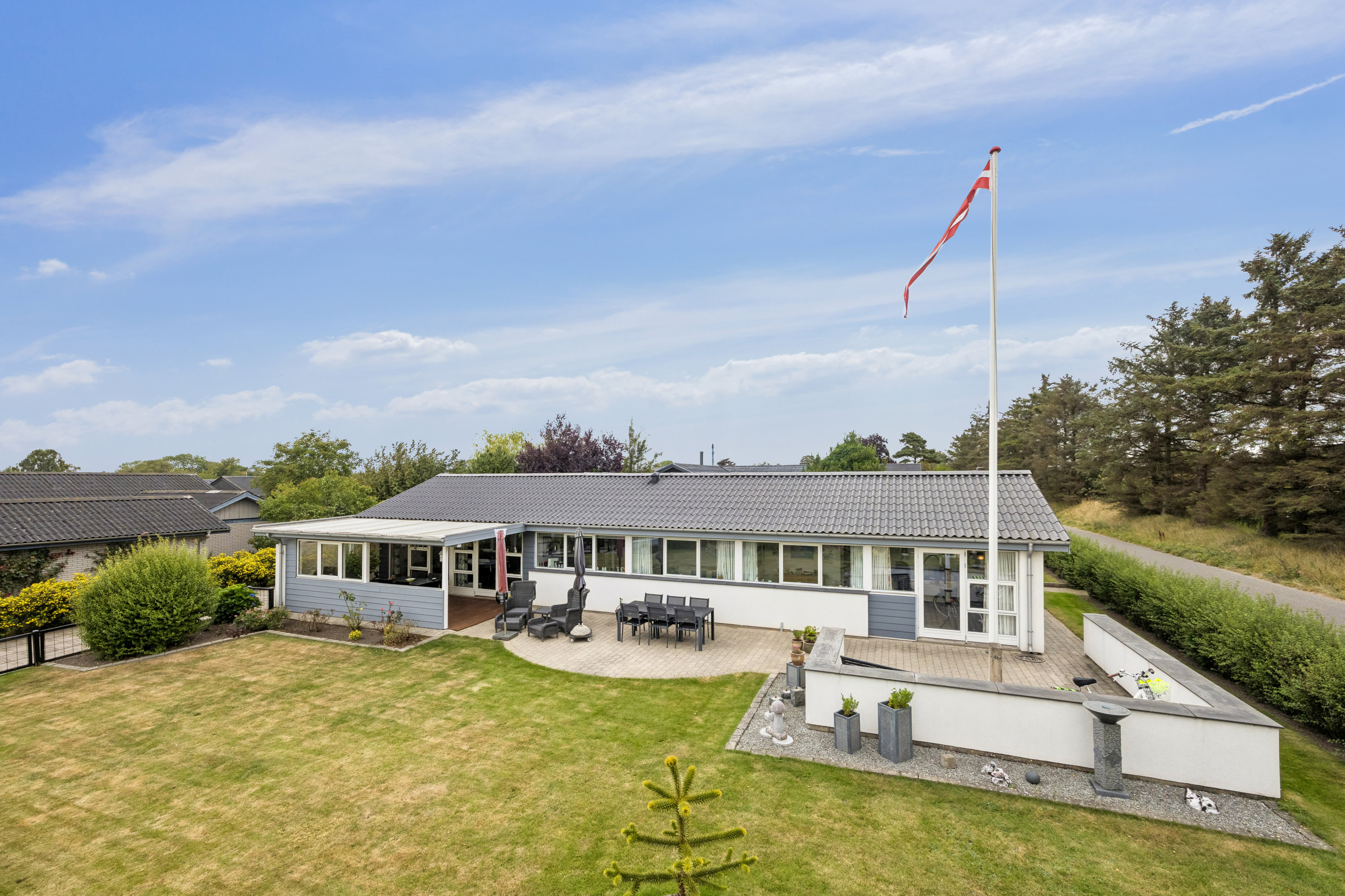 Grunden er overskuelig og nem at holde, samtidig med at der er plads til både leg, afslapning og hyggelige stunder på terrassen. Den lukkede vej giver en rolig atmosfære uden gennemkørende trafik, hvilket gør haven ekstra børnevenlig.