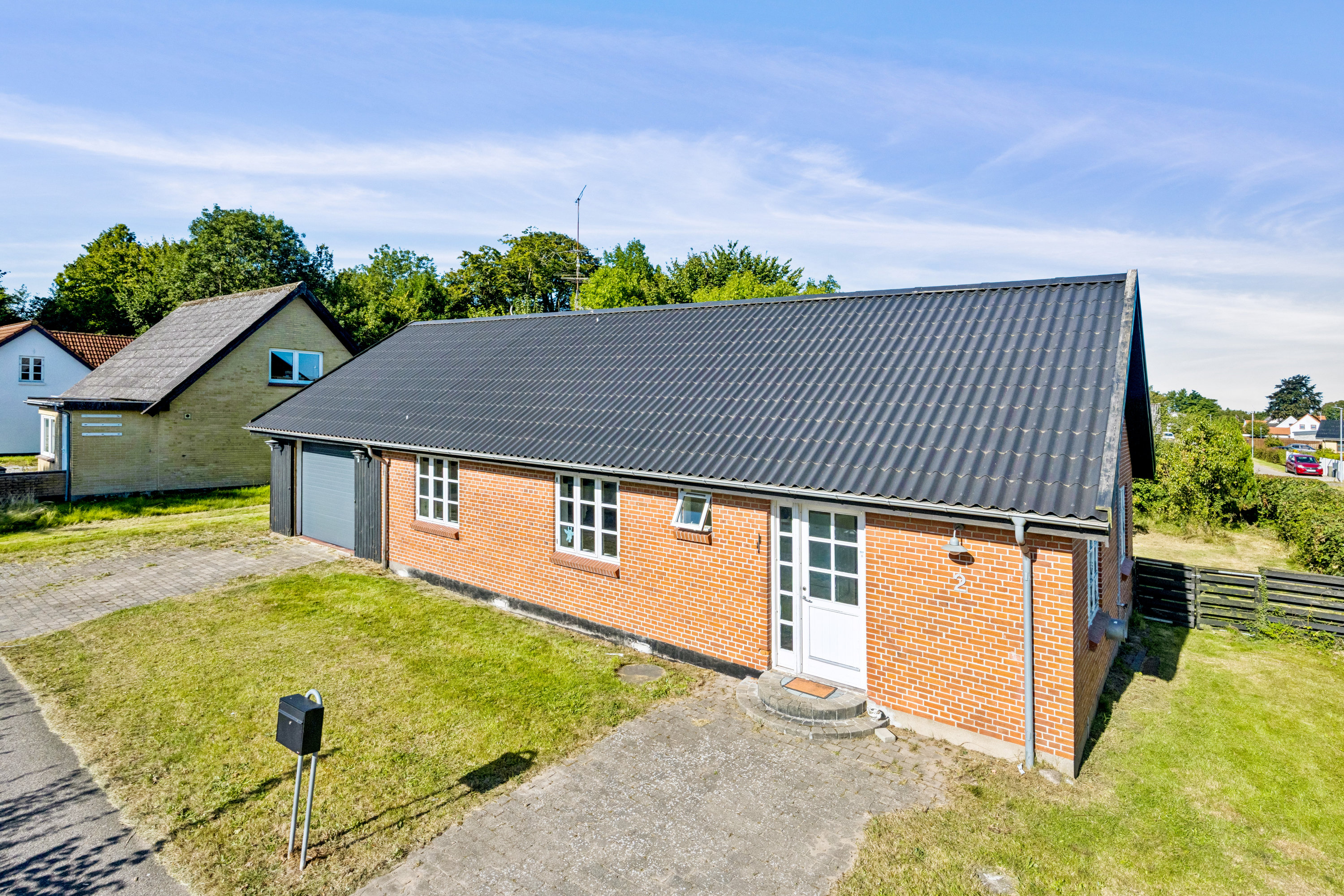 Som I svinger ned ad den lukkede Kirkestien og langsomt trækker op i indkørslen til villaen, er det til det glædelige syn af sprossede vinduer og røde sten stablet i ét plan. Garagen er integreret i ejendommen, og så fortsætter græsset ind under hegnet til den lukkede have. En dejlig nem have med sol fra vest og velvokset beplantning udfolder sig – og der går ikke lang tid, før græsplæne og fliser er renset og haven forvandlet til et fredeligt uderum. Ja, måske I endda vil plante blomsterbede og en lille urtehave?