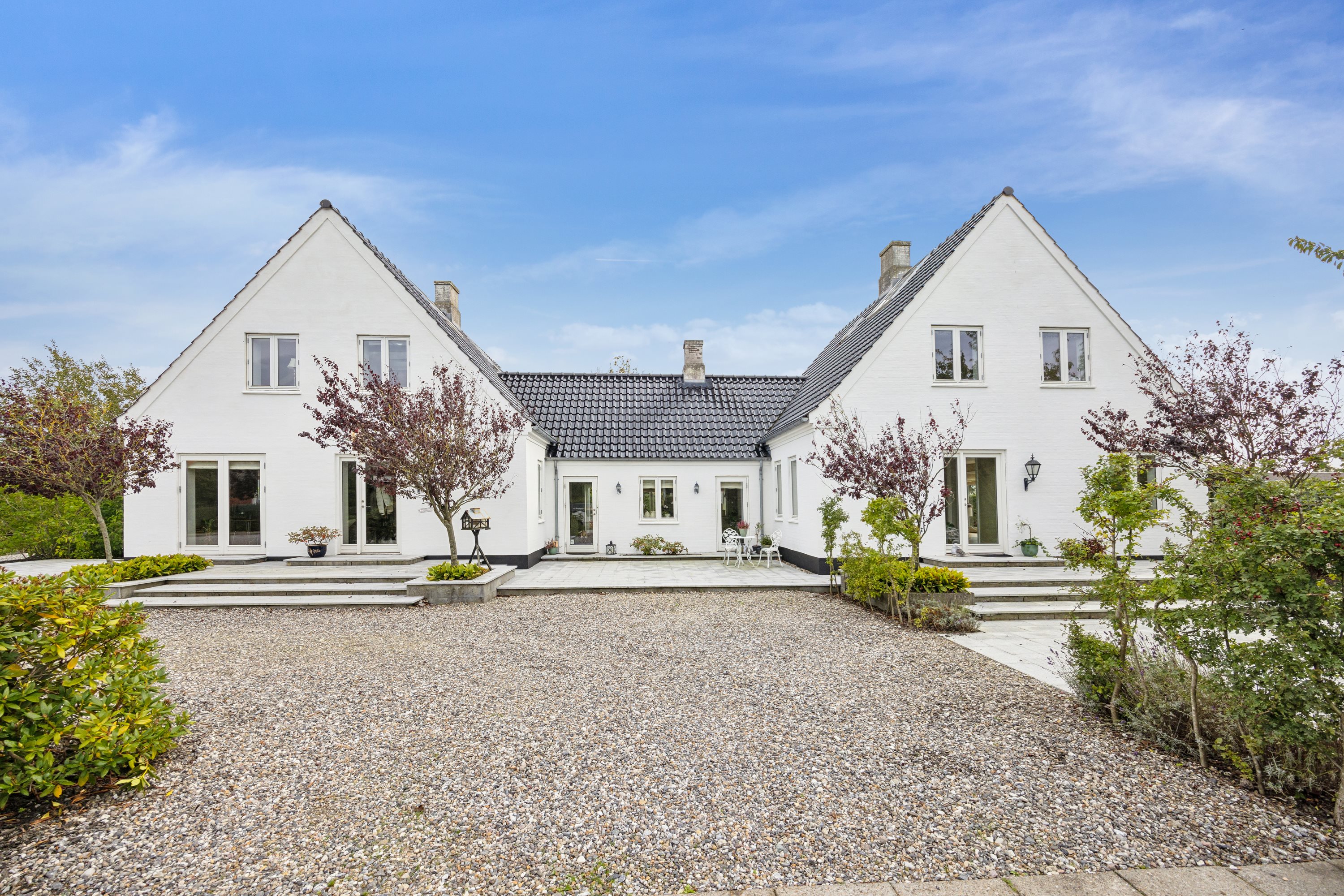 Udvendigt: Villaen fremstår flot med hvidmalet facade, sort glaseret tegltag og hvide vinduer og døre. Den store have er opdelt i flere skønne områder med rummelige terrassearealer, og indkørslen har god plads til flere biler.