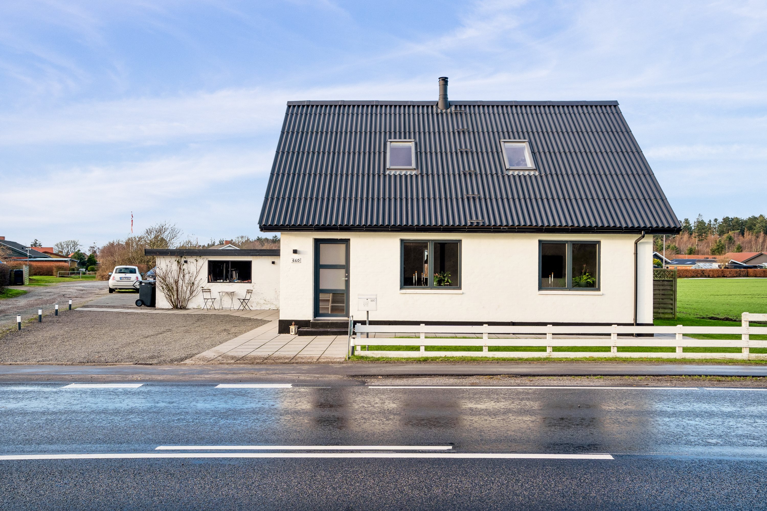 Ejendommen er opført i gode materialer og fremtræder med hvidmalet facade, der flot brydes af de mørke vinduespartier og døre samt taget. Foran huset er der plads til at parkere bilen, og i forlængelse heraf ligger det fine udhus, som har gode opbevaringsmuligheder. Foruden udhuset er der på grunden anlagt flere terrasseområder, der er orienteret fordelagtigt i forhold til solens bane, og så kan I samtidig sidde behageligt og beundre udsigten til det åbne landskab.