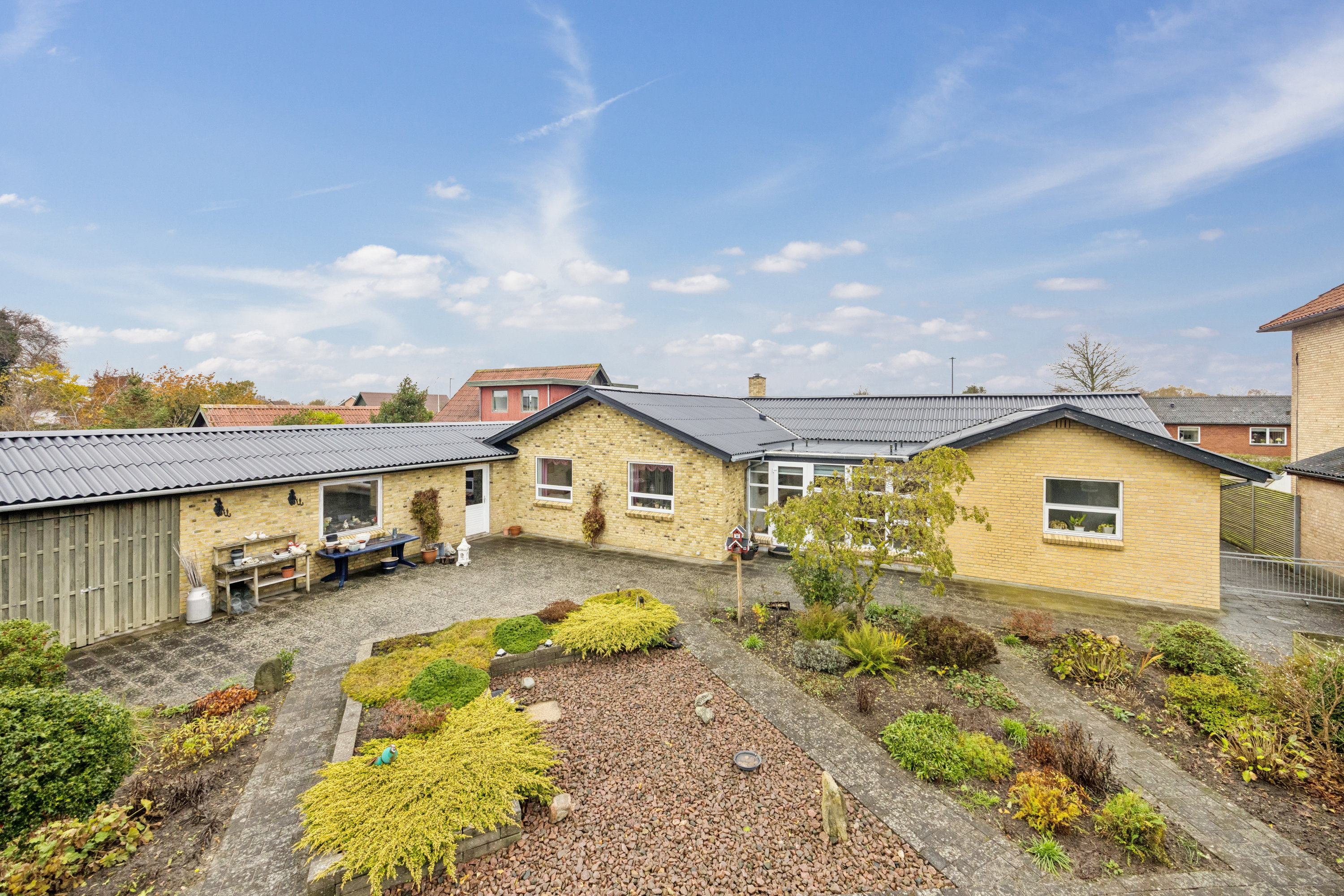 Villaen ligger på en rummelig grund på 1.048m2 bestående af stor flisebelagt indkørsel, flot anlagt gårdhave med stier, flotte beplantninger og mindre pavillon - der ville med fordel kunne anlægges græsplane hvis dette ønskes. Derudover forefindes fin garagebygning med el-port og integreret udhus i forlængelse heraf.
