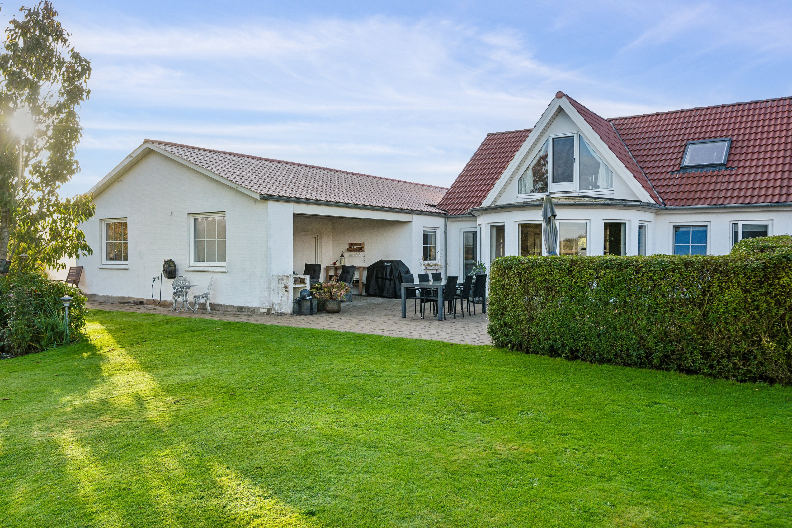 Når du træder ud i haven, træder du ind i en ægte havedrøm. Den store, flisebelagte terrasse, hvoraf en del er overdækket, er ideel til lange sommeraftener med grillmad og hyggelige stunder. Haven er smukt anlagt med snoede gangstier, en idyllisk havedam, et vildmarksbad og endda et shelter – det perfekte sted til eventyrlige overnatninger under åben himmel.