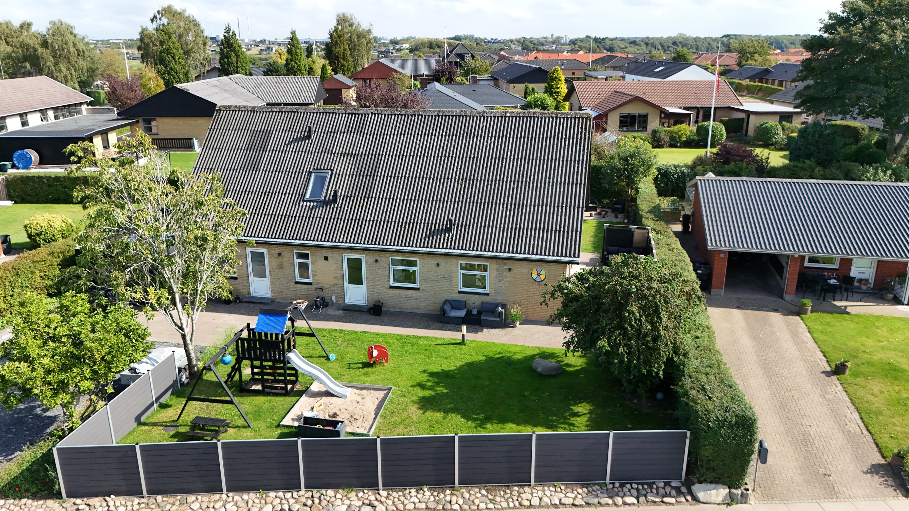 Villaen ligger på en skøn grund på 713 kvadratmeter, hvor en dejlig, lukket have med græsplæne og bålsted som indbyder til udeliv og hvor børnene kan lege frit.