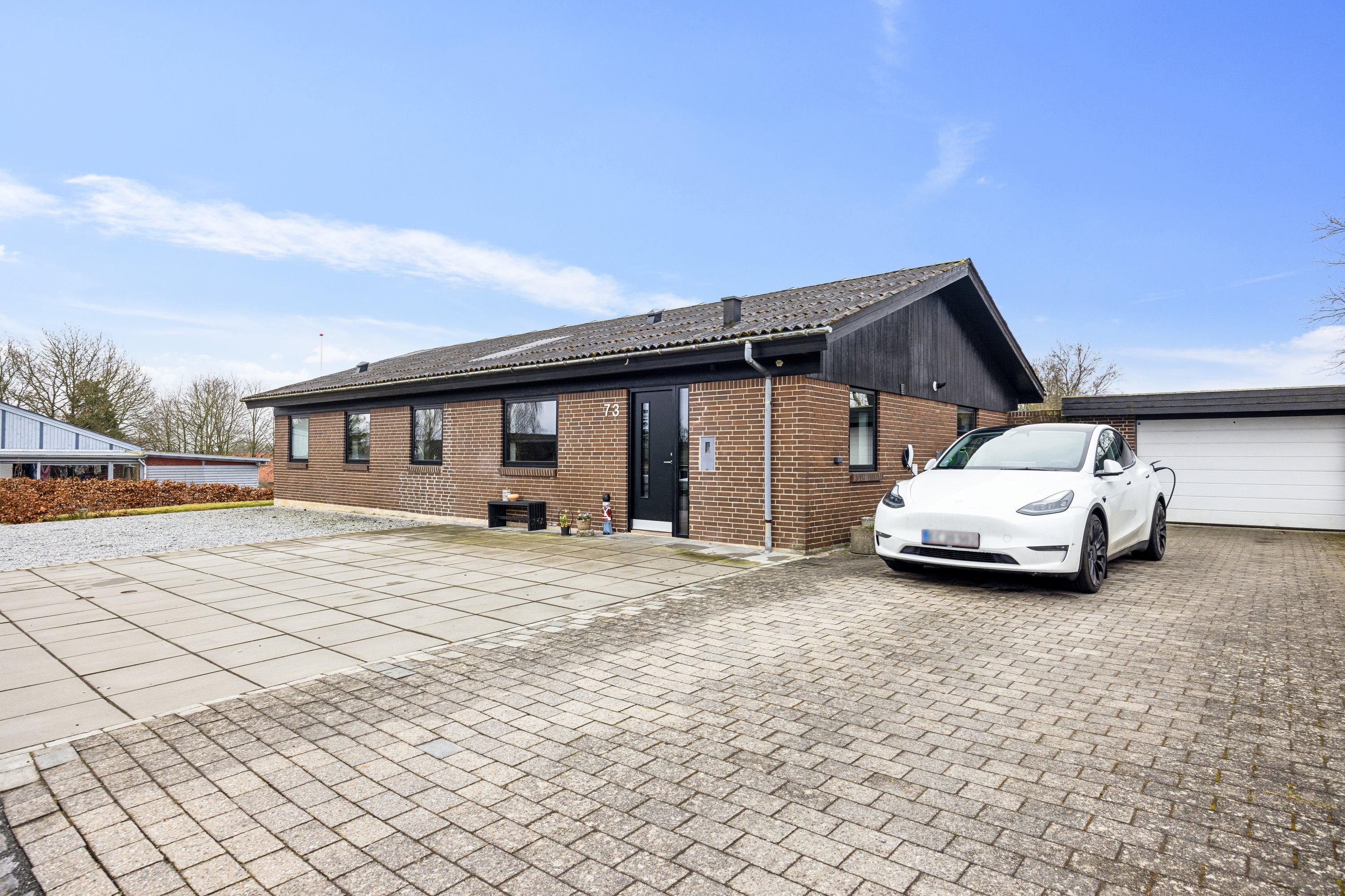Udendørs skaber den sydvendte, flisebelagte terrasse skaber den perfekte ramme for hyggelige grillaftener og lange sommeraftener under åben himmel. Haven er anlagt med et stort græsareal, hække og enkelte træer, mens forhaven præsenterer sig med granitskæver og en bred flisebelagt indkørsel, der leder op til garagen.