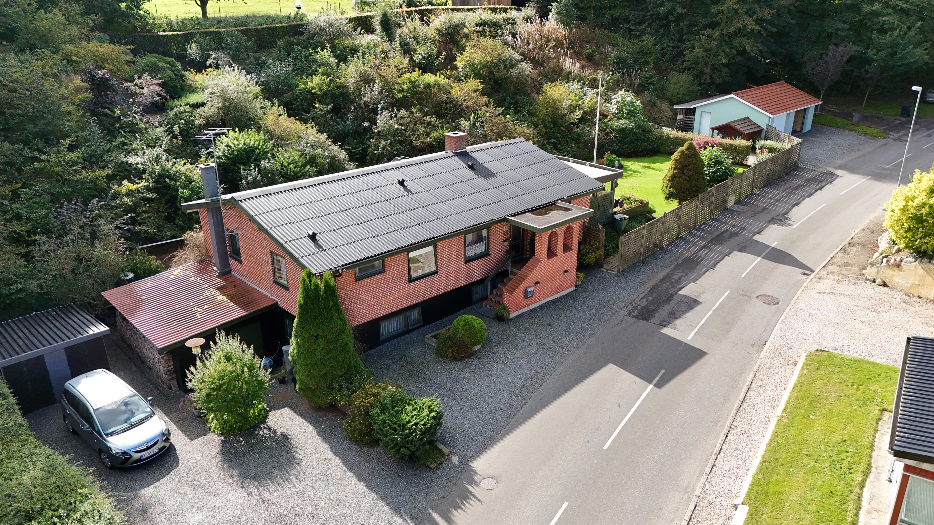 Udendørs er en frodig have – grøn, opvokset og fuld af liv med sine farverige blomster, buske og træer. Her står flagstangen klar til at vejre i vinden ved familiens højtidsdage og fejringer, og et lille udhus giver plads til opbevaring af haveredskaber.