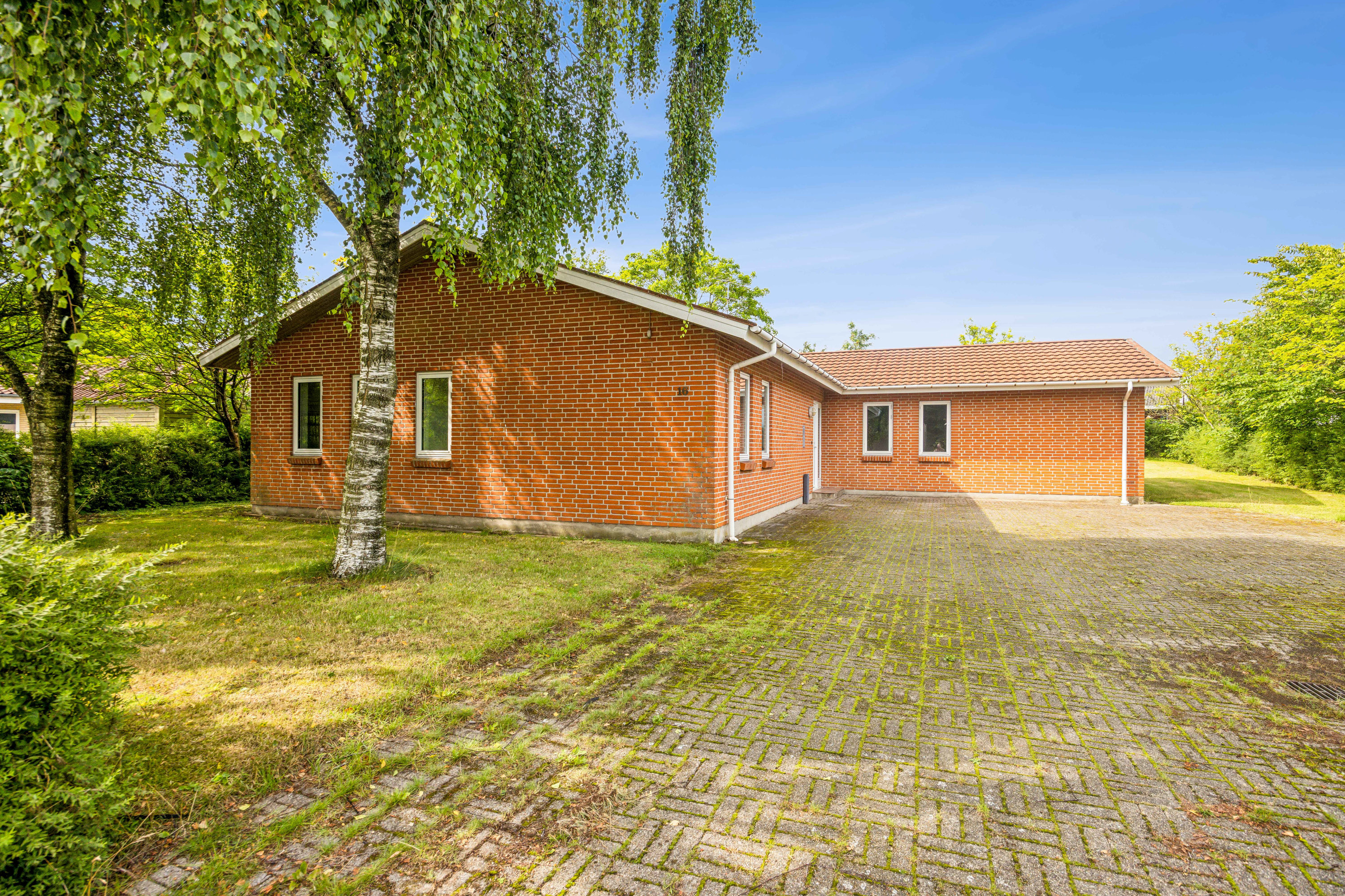 Udendørs byder grunden på en stor flisebelægning foran huset med rigelig plads til parkering. Den private have er omkranset af hæk og høje træer, som giver en rolig atmosfære og masser af privatliv. Haven er nem at holde med stor græsplæne og god plads til børneleg og udendørs hygge.