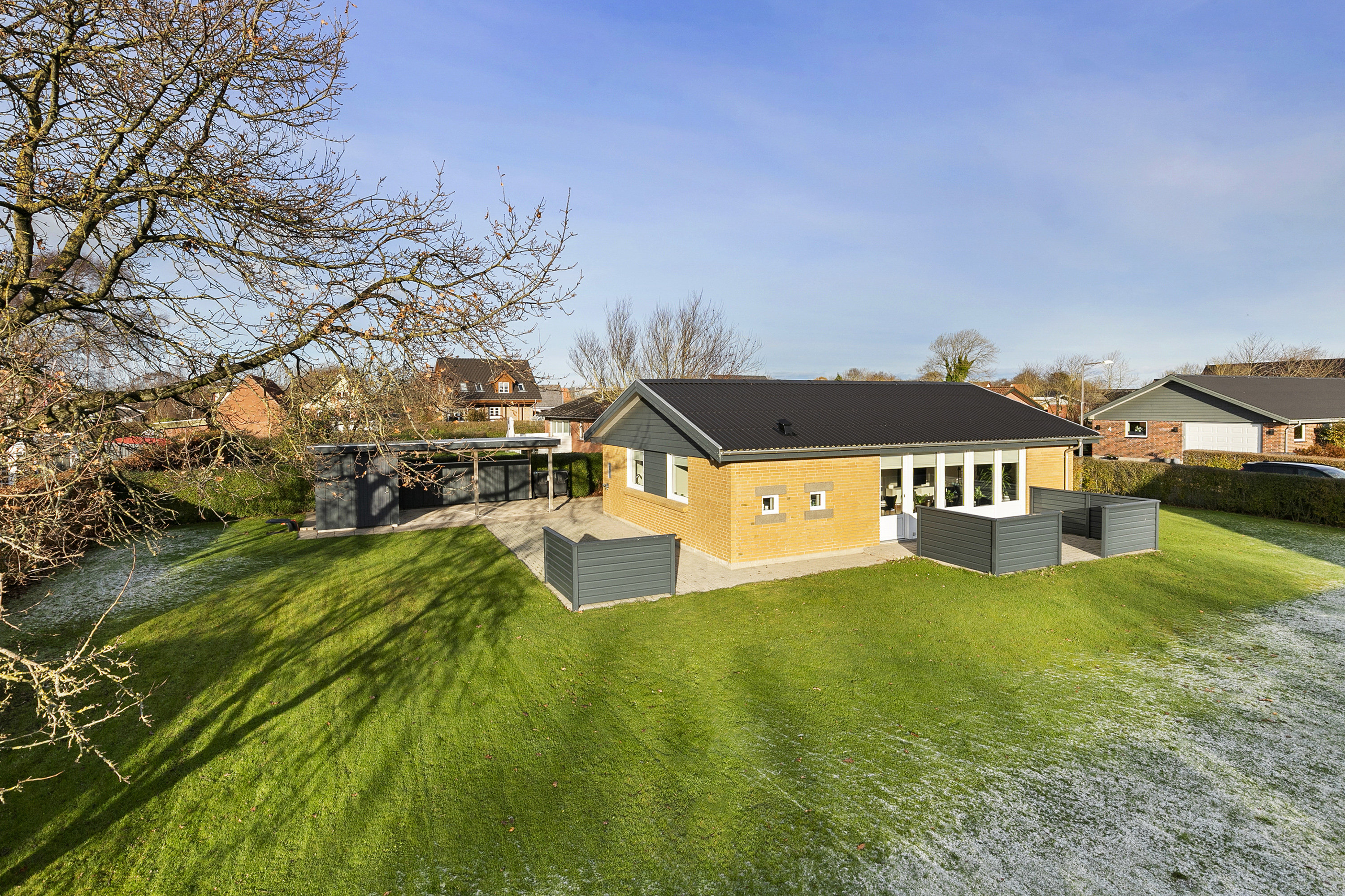 En carport med tilhørende skur sikrer beskyttelse til bilen og opbevaringsmuligheder for havesager og cykler, hvilket gør hverdagen mere overskuelig.