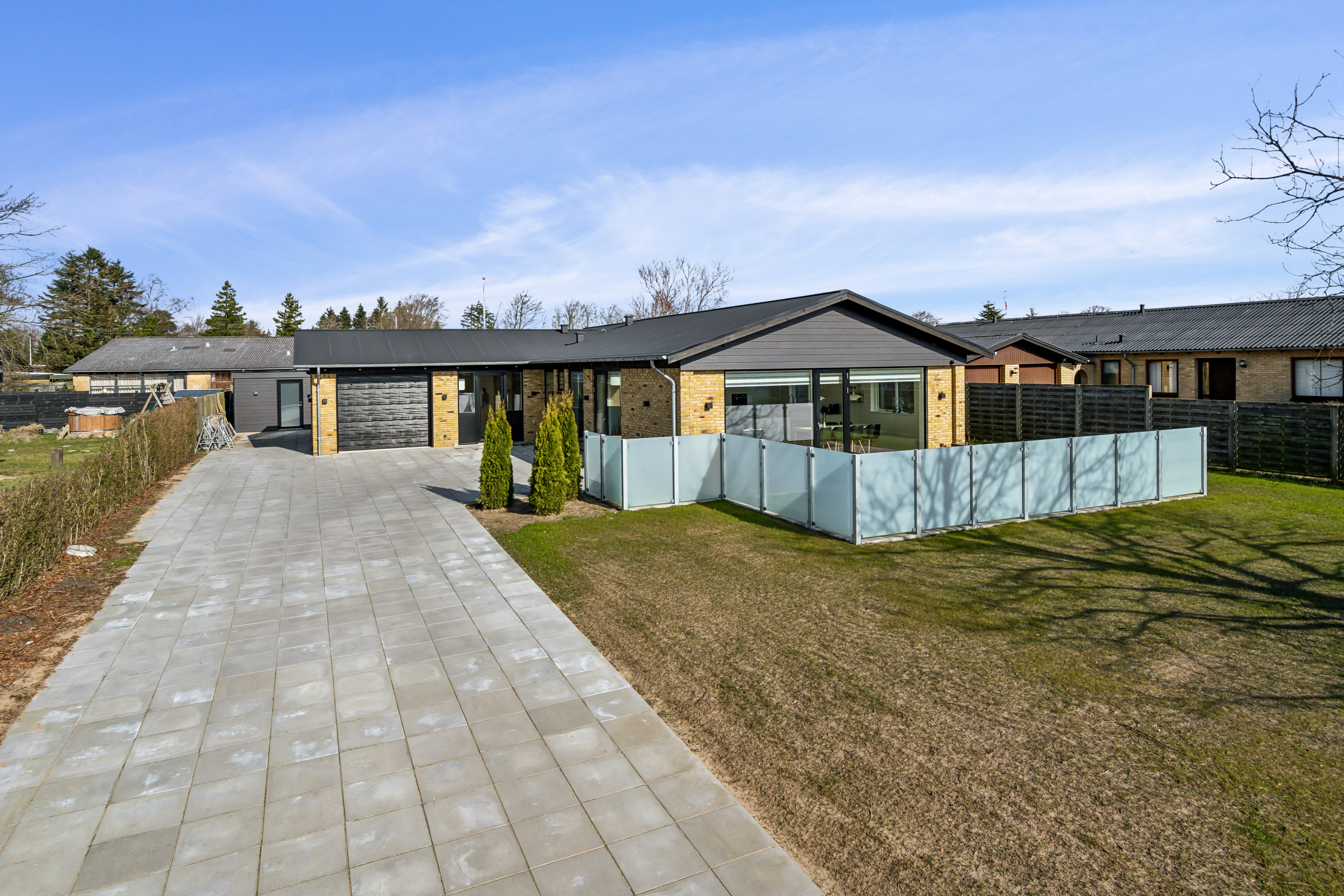 Huset er opført i 1964, men blev totalrenoveret i 2023-2024, så det i dag fremstår som et fuldkomment opdateret og moderne hjem. Tag med tagpap, vinduer og døre, køkken, badeværelser, bryggers, elinstallationer, vvs og kloak er alle fra 2023-2024, og der er etableret gulvvarme i hele huset for optimal komfort. Derudover er der blevet installeret ventilationsanlæg i huset, samt alarm og videoovervågning rundt om hele huset. Facaden med de gule mursten og mørke træpartier giver et varmt og stilrent udtryk, mens store glaspartier trækker lyset helt ind i boligen og afslører det åbne, sammenhængende rumforløb, som udgør hjemmets hjerte.