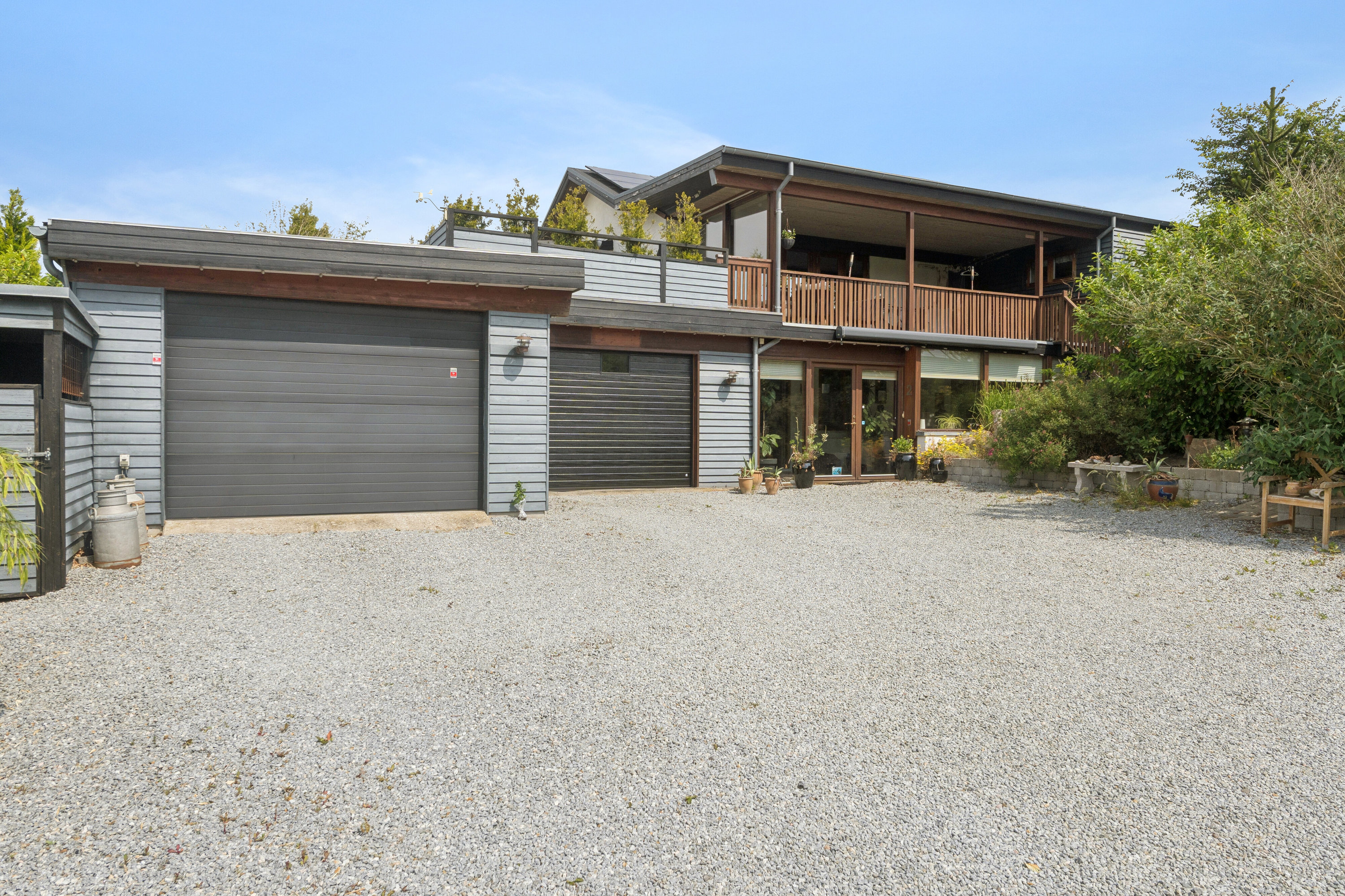 Fra kælderplanet er der direkte adgang til haven via dobbeltdøren, mens øverste plan er forsynet med de mest fantastiske altaner. Der er både åbne og overdækkede at vælge mellem, og fælles for hele puljen er udsigten, som strækker sig over tage, træer, vindmøller og himmel. For foden af ejendommen venter gode græsarealer med stedvis beplantning og en hyggelig krog.