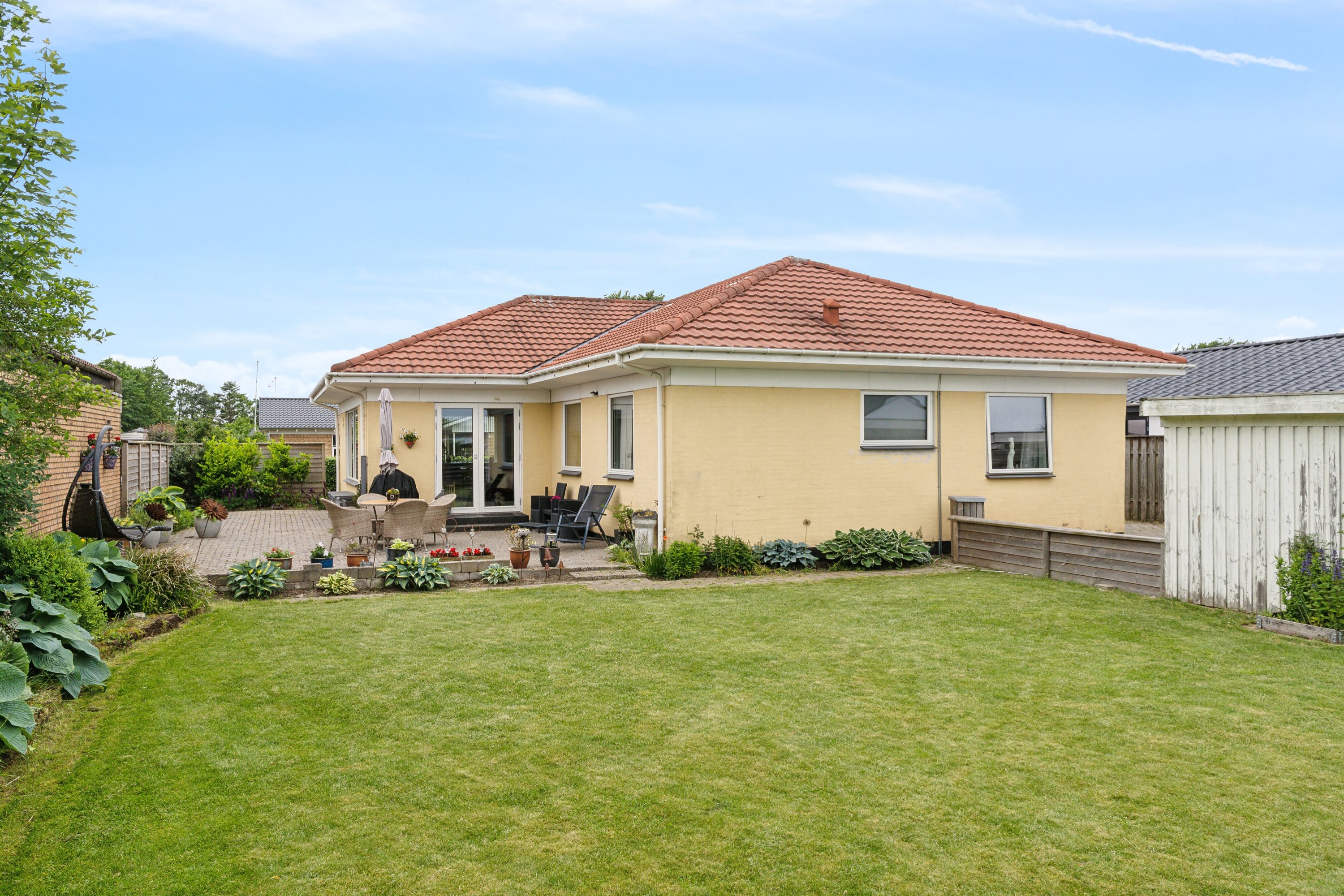 Udenfor fuldendes boligen af en stor have med et dejligt terrasseareal mod sydøst samt en velanlagt græsplæne og bede. Haven er tilmed velafskærmet og sikrer jer således privatliv til afslapning i solen såvel som leg. På grunden findes også to carporte.