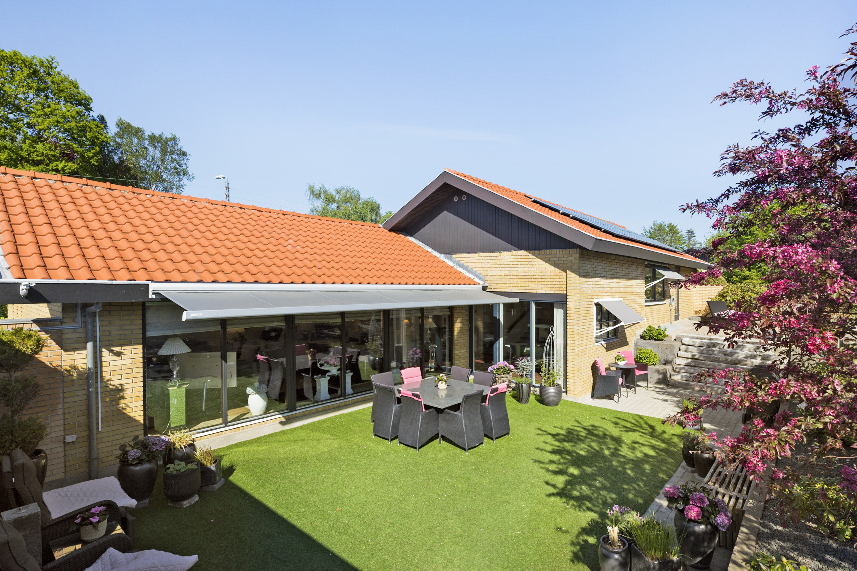 Udendørs venter en privat og velanlagt have med en sydvendt terrasse/solgård, hvor du kan nyde solen hele dagen. Den store markise giver skygge efter behov, og med 24 udendørslamper styret af tidsur skabes en hyggelig stemning, når mørket falder på.