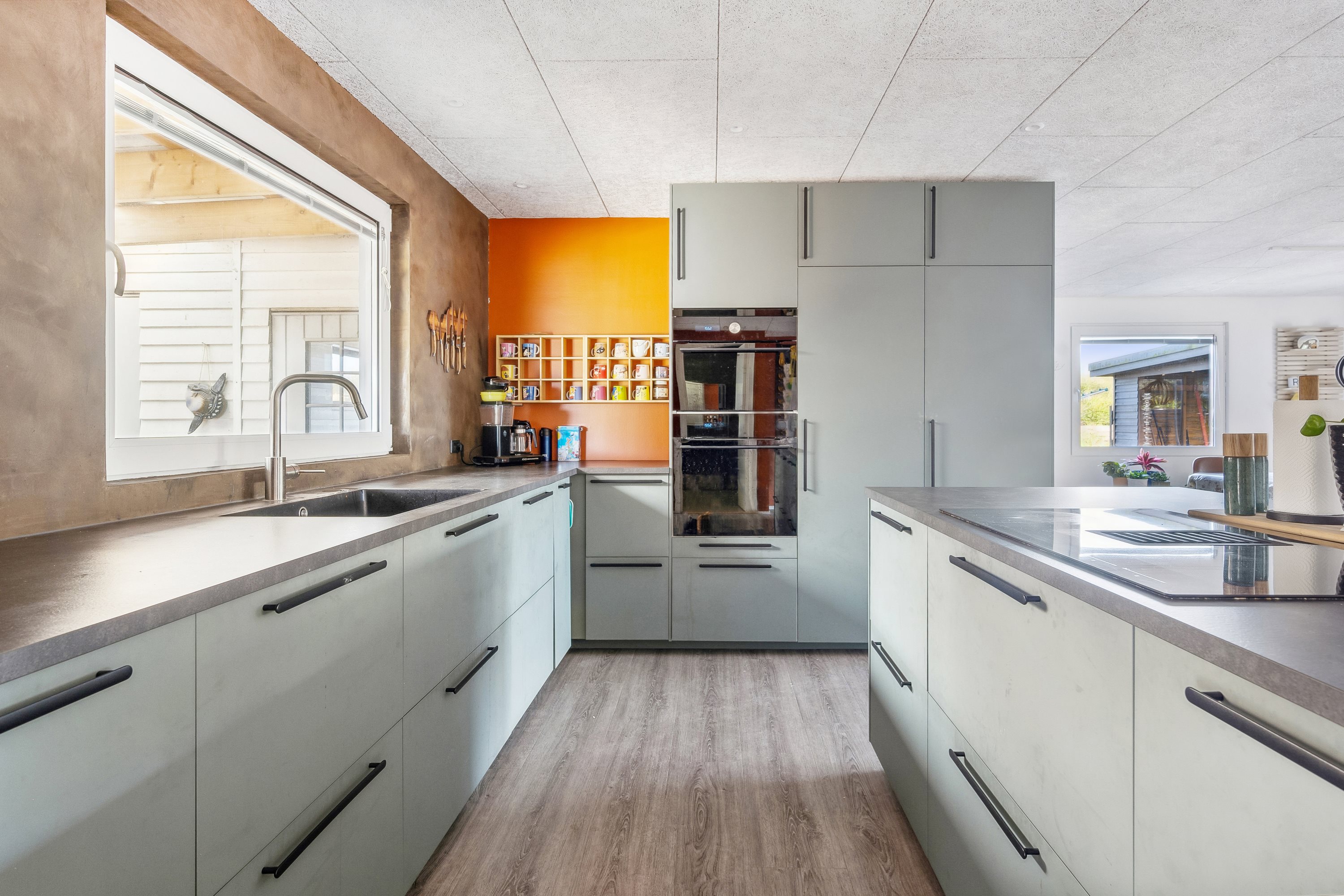Boligen råder over fire regulære værelser samlet i en soveafdeling i den ene side af villaen, et moderniseret badeværelse med bruseniche i ‘New York Style’ samt et bryggers med egen indgang til tøjvask og praktiske gøremål. Fra fordelingsentréen, med adgang til alle boligens leverum, bliver I dog med garanti først og fremmest draget mod husets hjerterum, den stilige og rummelige kombinerede stue og køkken-alrum, som lægger op til timevis af hyggeligt samvær. Køkkenet har masser af bordplads, god skabsplads og hele to ovne i arbejdshøjde. Til køkkenet hører en rummelig køkkenø, som skaber en dejlig overgang til spiseområdet, hvor der er nok meter til et langbord, der kan huse hele familien. I bunden af husets hjerterum kan I indrette sofakrog og tv-hjørne, og herfra er der et dejligt gulv-til-loft-vindue, ligesom I kan tilgå haven fra en terrassedør.