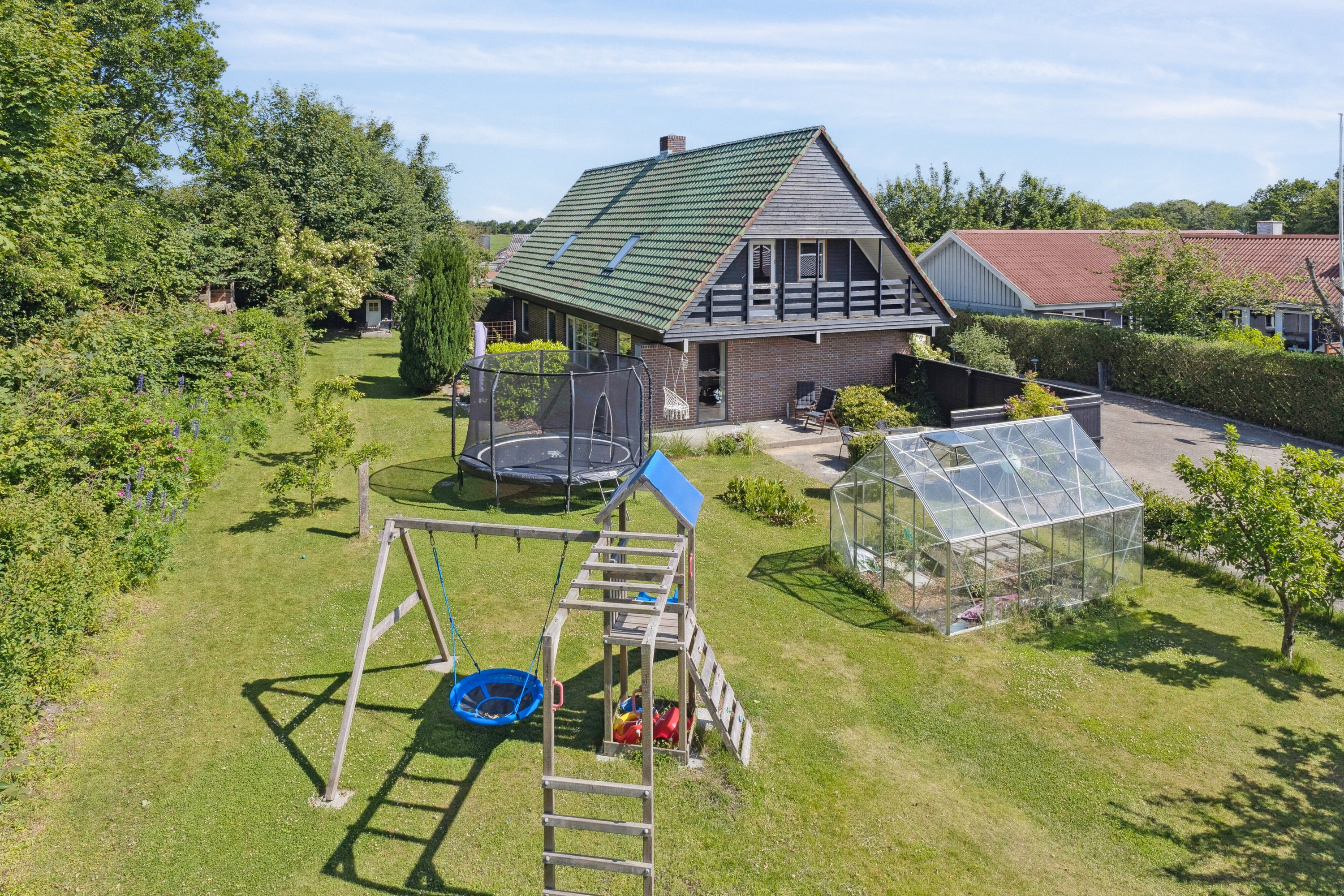 Udenfor venter en dejlig have, hvor både børn og voksne kan nyde naturen. Den sydvendte grund giver mulighed for at nyde solen hele dagen, og terrasseområderne indbyder til udendørs samvær.