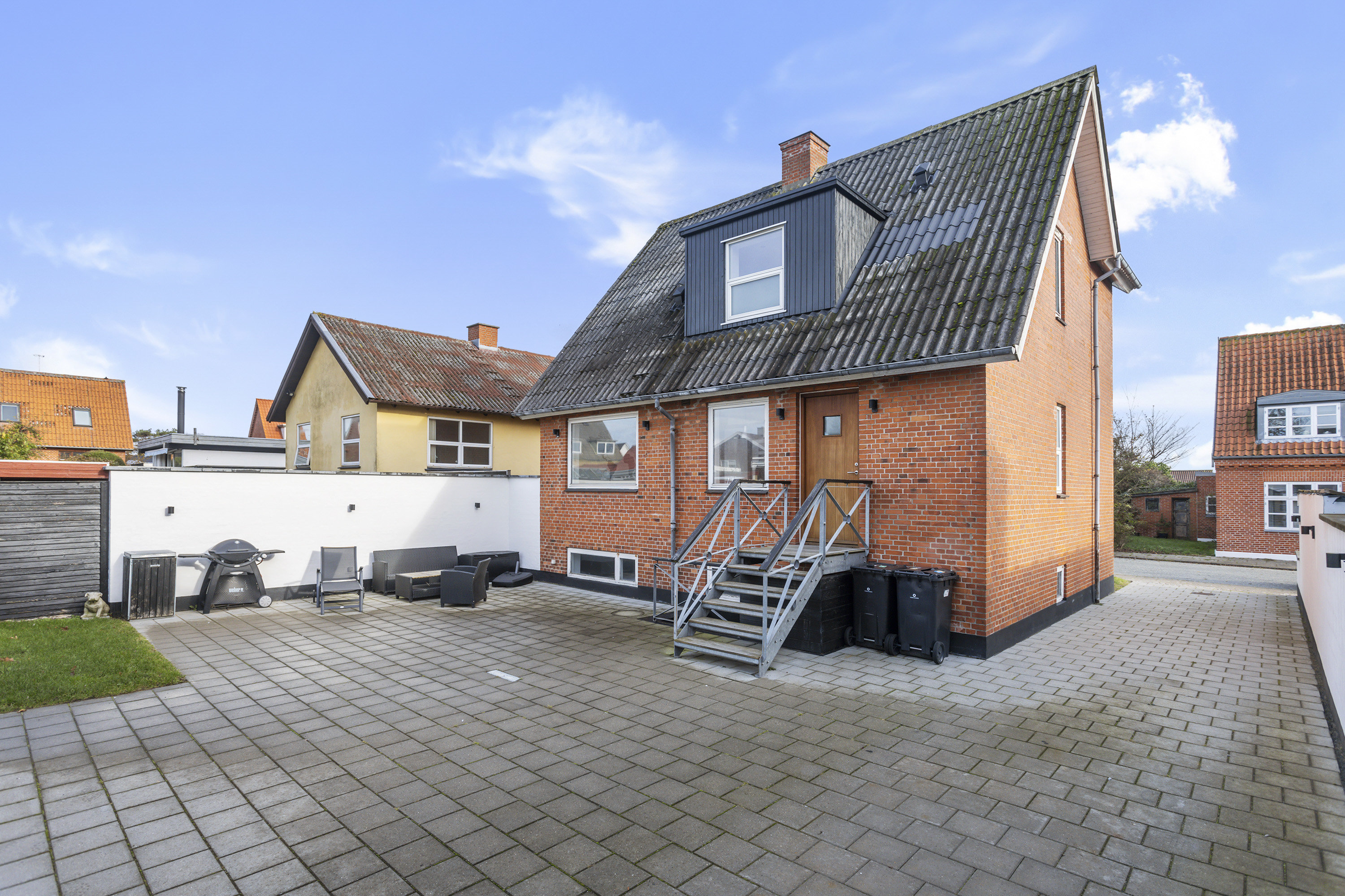 Den store flisebelagte terrasse fungerer som hjemmets udendørs opholdsområde og binder huset sammen med garage og have. Grunden indeholder et grønt areal med plads til leg og bevægelse samt mulighed for at anlægge bede eller en terrasse mere mod syd.