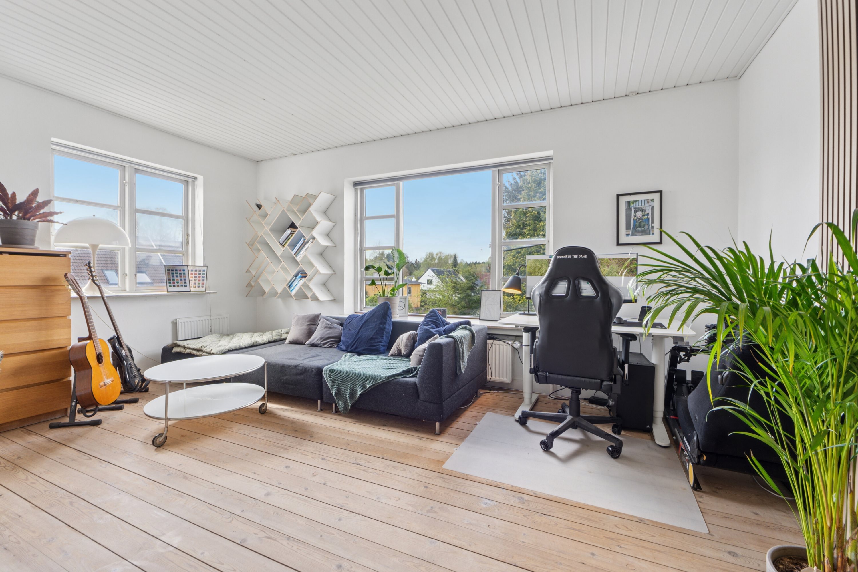 Boligen ligger på toppen af en villa med søde underboer og er inden for de seneste år blevet hulmursisoleret og lyddæmpet i etageadskillelsen.