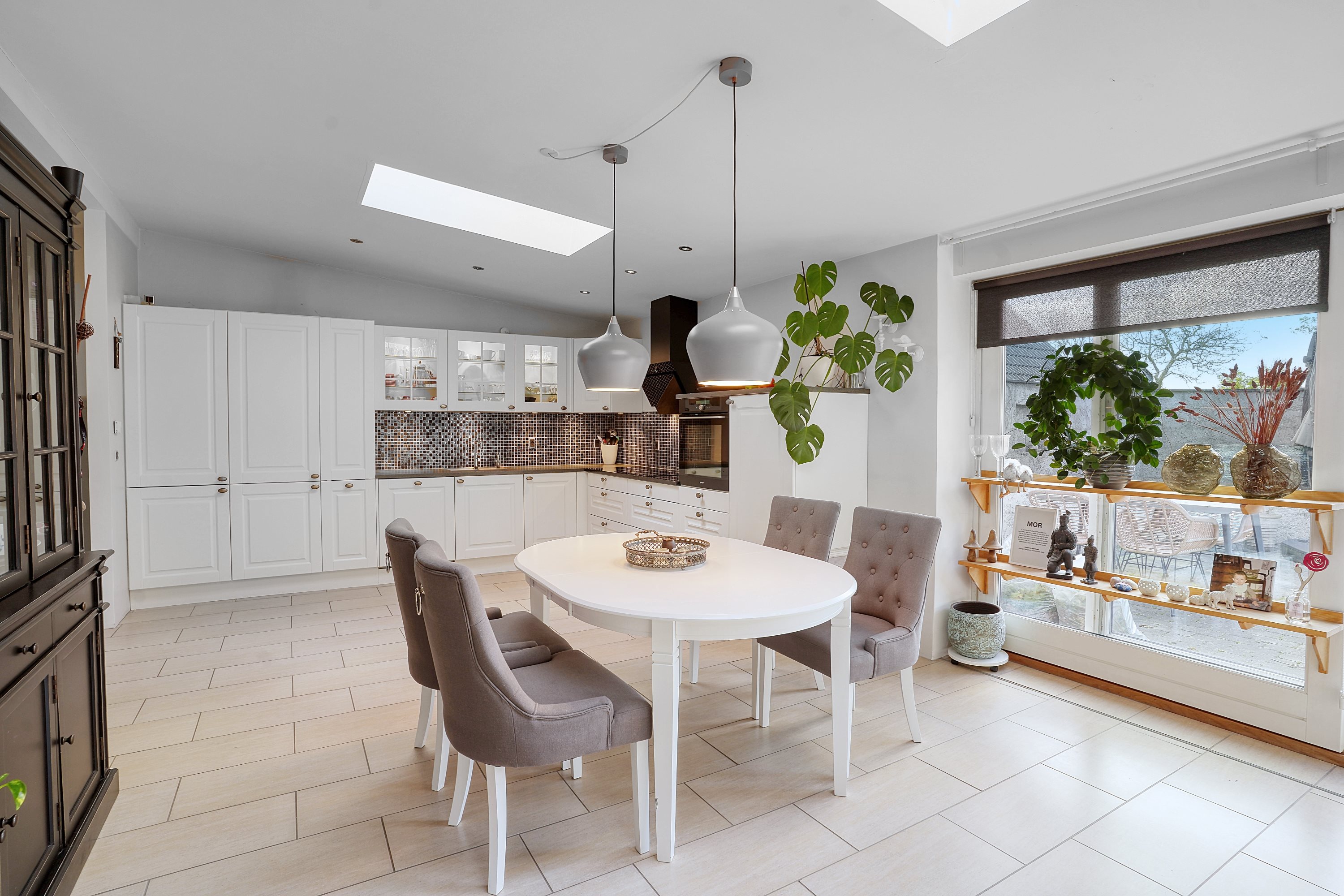 Ud for alrummet er der etableret et stort gårdhavemiljø, der i de varme måneder fungerer som en naturlig forlængelse af det lækre alrum. Her er plads til langbord, loungemøbler, grill og vildmarksbad og trappe, der fører op til et hyggeligt havestykke. Foran huset giver en rummelig indkørsel plads til flere biler.