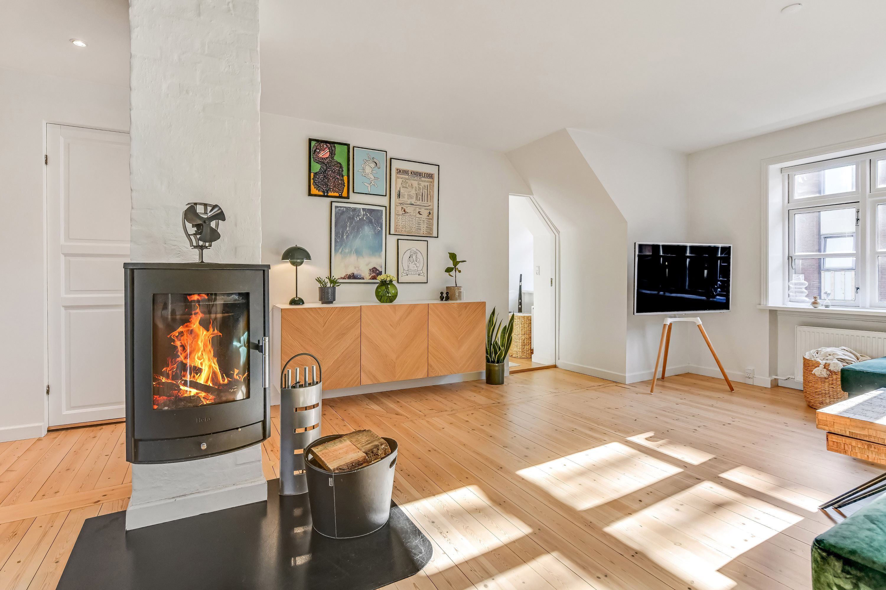 I boligen har vi et hyggeligt væghængt brændeovn som virkelig giver sjæl og charme i lejlighedens hjerte. Super flot HTH-køkken med hvide grebsfrie låger og godehvidevarer.
